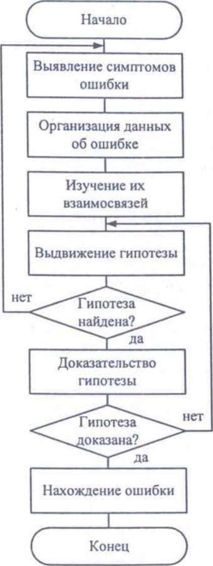 Метод основан на тщательном анализе симптомов ошибки, которые могут проявляться как неверные результаты вычислений или как сообщение об ошибке. Если компьютер просто «зависает», то фрагмент проявления ошибки вычисляют, исходя из последних полученных результатов и действий пользователя. Полученную таким образом информацию организуют и тщательно изучают, просматривая соответствующий фрагмент программы. В результате этих действий выдвигают гипотезы об ошибках, каждую из которых проверяют. Если гипотеза верна, то детализируют информацию об ошибке, иначе — выдвигают другую гипотезу. Последовательность выполнения отладки методом индукции показана на рисунке в виде схемы алгоритма.
