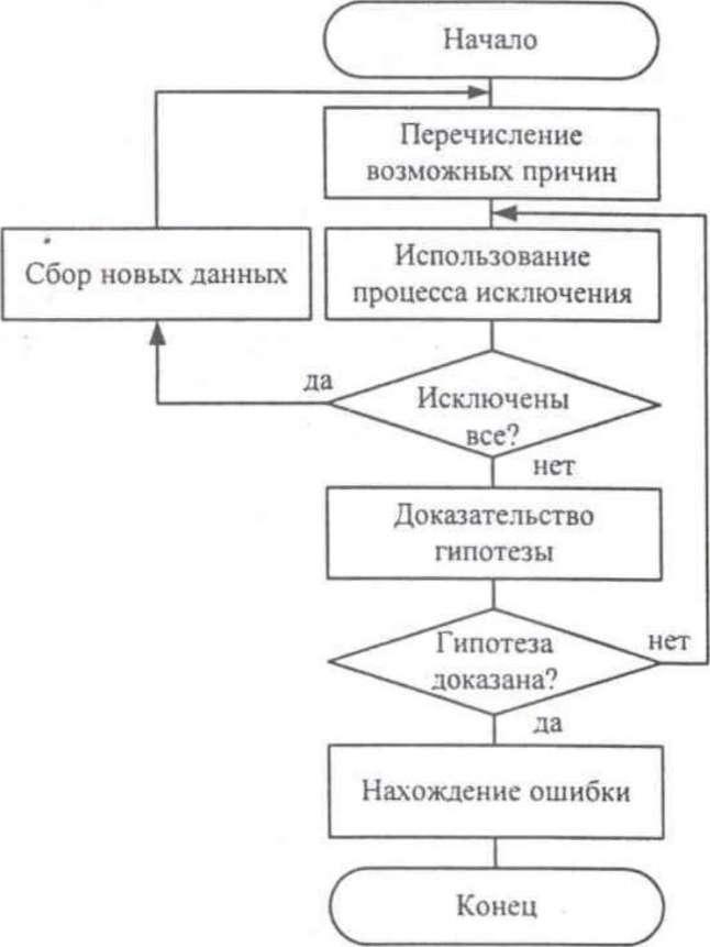 По методу дедукции вначале формируют множество причин, которые могли бы вызвать данное проявление ошибки. Затем анализируя причины, исключают те, которые противоречат имеющимся данным. Если все причины исключены, то следует выполнить дополнительное тестирование исследуемого фрагмента. В противном случае наиболее вероятную гипотезу пытаются доказать. Если гипотеза объясняет полученные признаки ошибки, то ошибка найдена, иначе — проверяют следующую причину.