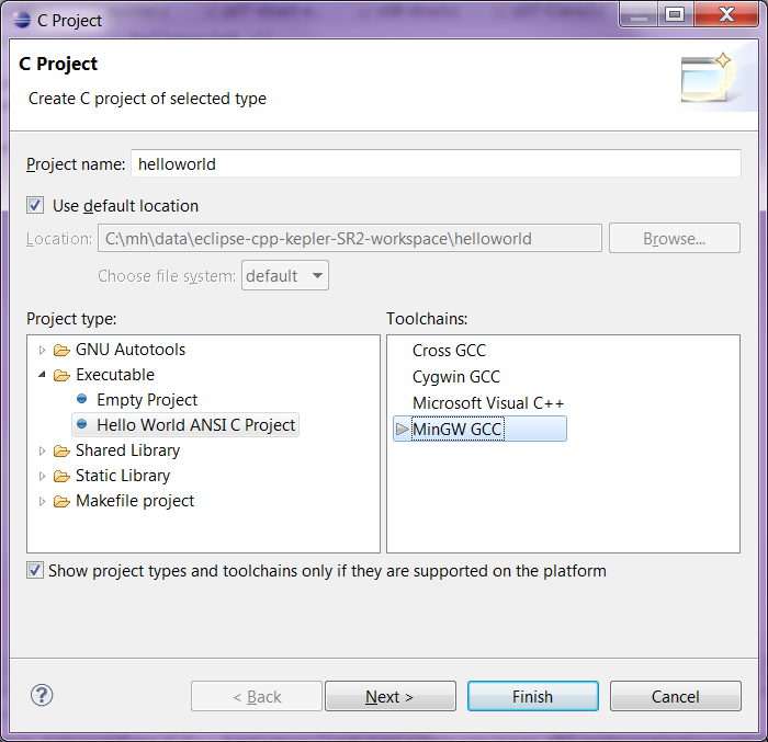 - Select project type «Hello World ANSI C Project» and toolchain «MinGW GCC»