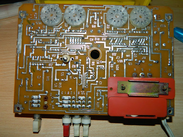 В частотозадающих цепях установлены качественные керамические конденсаторы и кварцевый резонатор в миниатюрном корпусе. Остальные компоненты характерны для советской бытовой техники: конденсаторы К10-7, К50-16 и К50-35; резисторы С1-4; микросхемы в пластиковых корпусах.