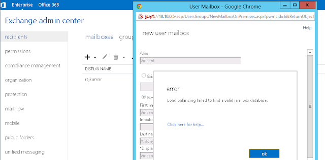 When these commands are executed, we may get the error saying “Load balancing failed to find a valid mailbox database”. If we try to enable or create a mailbox using the Exchange Admin Center (EAC), we may still get the same error.