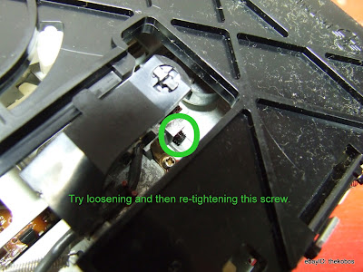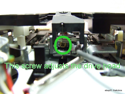 The next thing you can try doing is adjusting the drive head. To do that, you need to turn the screw above 1/8th turns at a time to see if it makes a difference. Be careful not to strip this screw! If you strip it, game over.