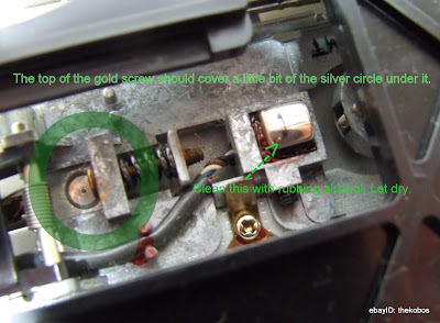 The ideal position I have found is shown in the picture above. You want to have the top of the gold screw positioned slightly over the silver circle below it. While you’re at it, swab the little silver thing with rubbing alcohol and let it air dry.
