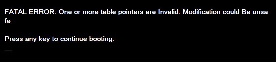 «Fatal error: One or more table pointers are invalid. Modification could be unsafe… Press any key to continue boot»