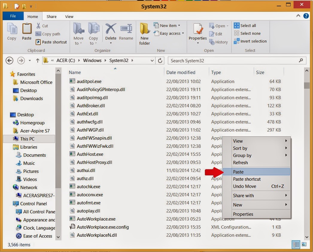STEP 8: Right-click inside the ‘System32’ folder and select Paste from the drop-down menu to paste the ‘bootsect.exe’ file.