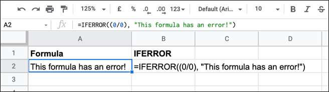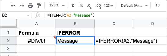 Второй аргумент в формуле ЕСЛИОШИБКА — это настраиваемое сообщение об ошибке, которое заменяет собственное сообщение Google Таблиц. Например, на рисунке выше показано, что деление нуля на ноль невозможно. Вместо отображения сообщения об ошибке Google (# DIV / 0!) Появляется собственное сообщение об ошибке.