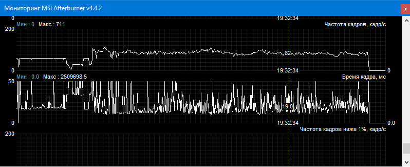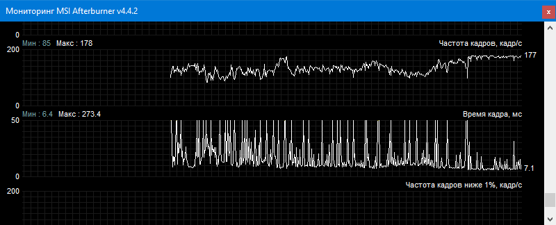 Когда график времени кадра резко ползет вверх — это уменьшение плавности игры. Когда ползет вниз — это увеличение плавности.
