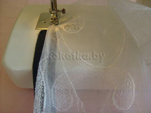 Косая лента останется плоской, пока к ней пришивается присборенный тюль.