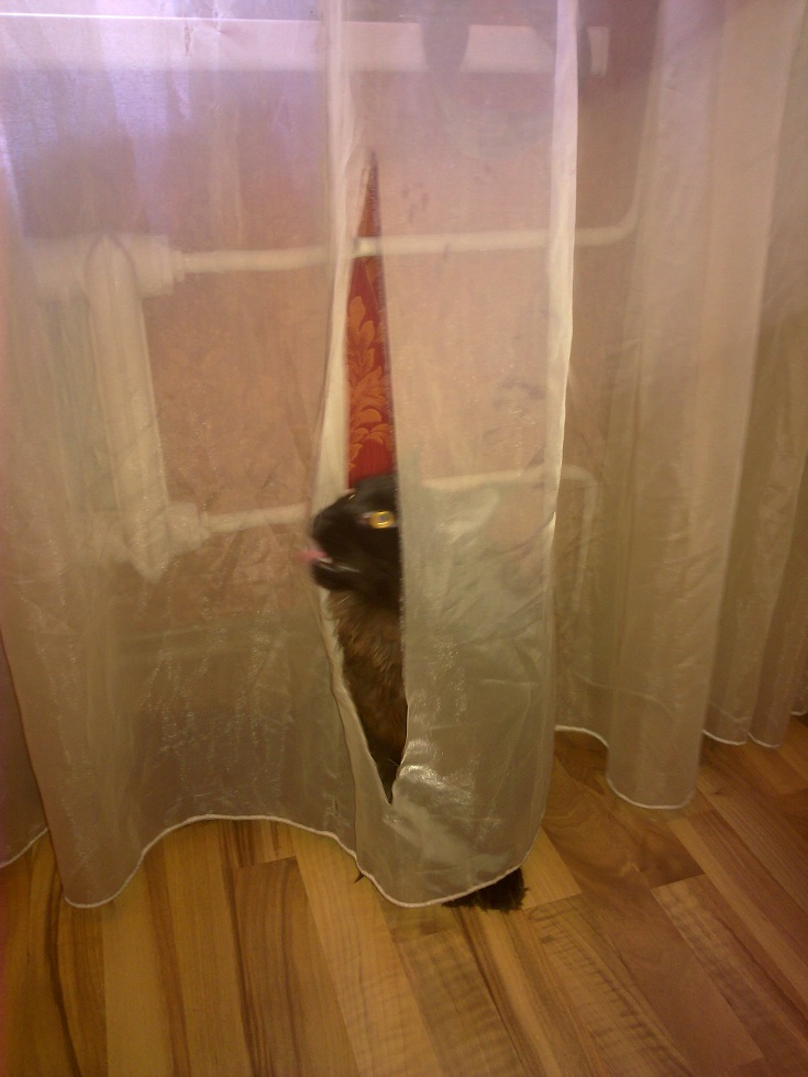 Если же требуется зашить тюль, разорванный кошкой по вертикали (такое случается, если животное повисает на тонкой ткани), проще всего использовать термоленту паутинку, продаваемую в магазинах рукоделия. Нитки в месте разрыва аккуратно совмещаются, с изнанки подкладывается дополнительная нить, обеспечивающая прочность, а сверху накладывается термолента. Место разрыва будет заметно, если оно будет находиться на фоне освещения из окна, но это лучше дырявой шторы.