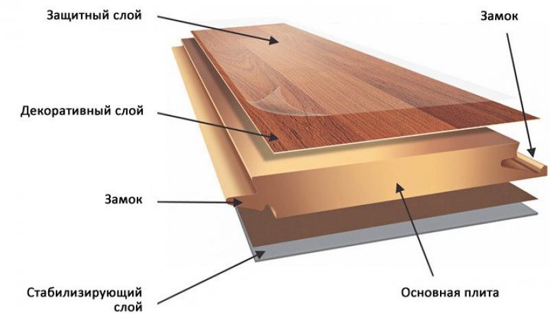 Чаще механические воздействия деформируют или разрушают наружные слои ламината. Сверху расположена прозрачная защитная плёнка из меламиновой или акриловой смолы, чуть ниже – декоративный слой, имитирующий породы дерева или другие материалы и состоящий из обработанной целлюлозы или мебельной фольги.
