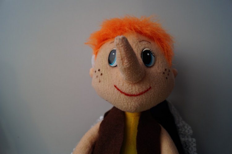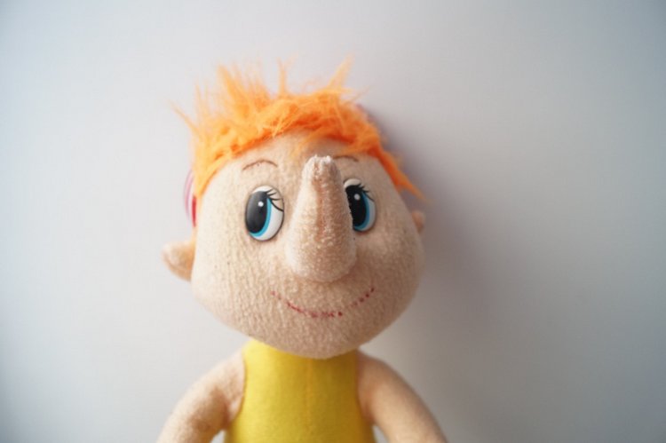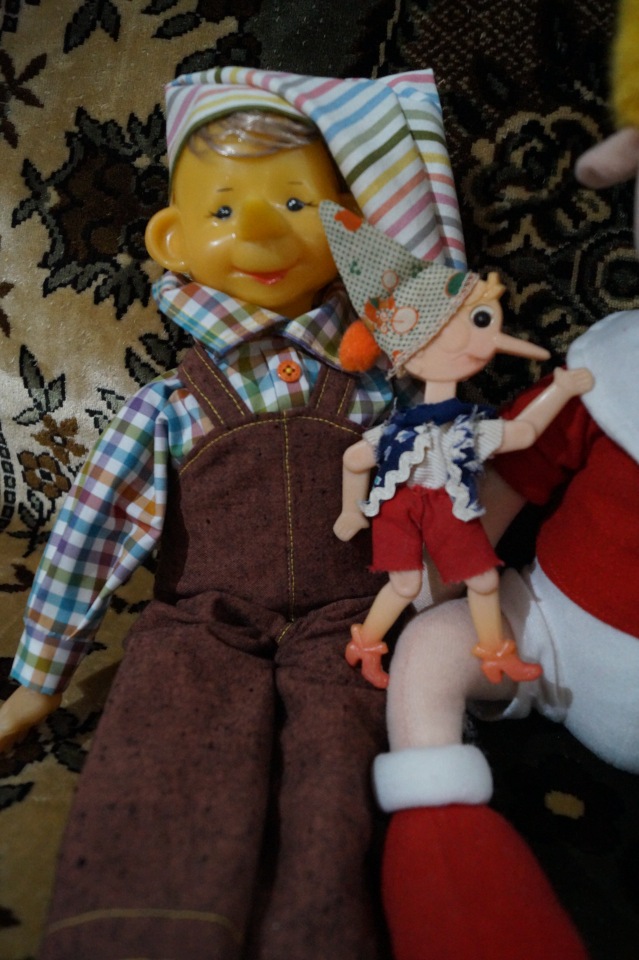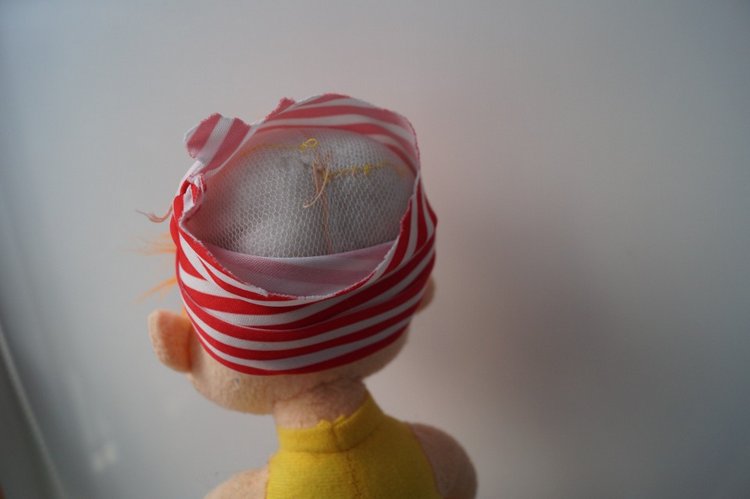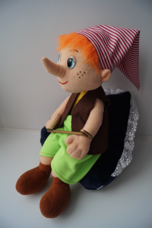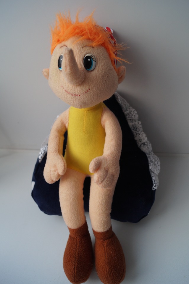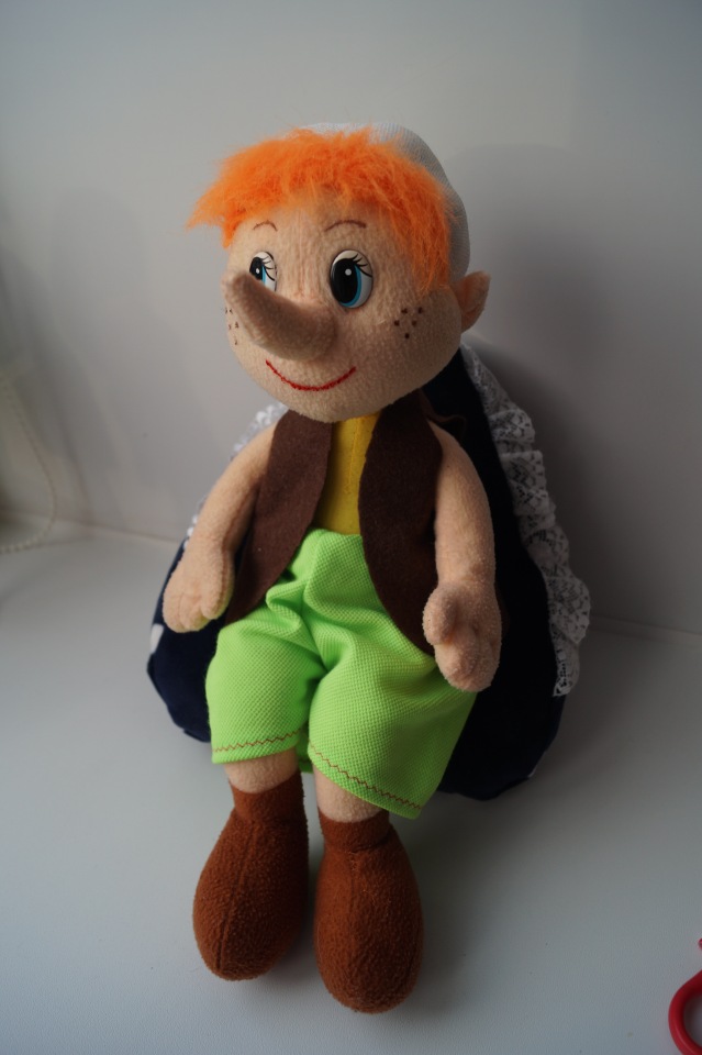 Нужно заменить отрезанный колпачок, подрисовать ротик, конопушки. Сшить шортики и разлетаечку, по книге папа Карло склеил курточку из остатков коричневой бумаги.