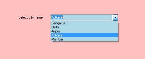 usingSystem;usingSystem.Collections.Generic;usingSystem.ComponentModel;usingSystem.Data;usingSystem.Drawing;usingSystem.Linq;usingSystem.Text;usingSystem.Threading.Tasks;usingSystem.Windows.Forms;namespaceWindowsFormsApp11 {publicpartialclassForm1 : Form {publicForm1(){InitializeComponent();}privatevoidForm1_Load(objectsender, EventArgs e){Label l =newLabel();l.Location =newPoint(222, 80);l.Size =newSize(99, 18);l.Text ="Select city name";this.Controls.Add(l);ComboBox mybox =newComboBox();mybox.Location =newPoint(327, 77);mybox.Size =newSize(216, 26);mybox.Sorted =true;mybox.BackColor = Color.LightBlue;mybox.Name ="My_Cobo_Box";mybox.Items.Add("Mumbai");mybox.Items.Add("Delhi");mybox.Items.Add("Jaipur");mybox.Items.Add("Kolkata");mybox.Items.Add("Bengaluru");this.Controls.Add(mybox);}}}Output:
