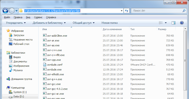 В среде разработки Ардуино нет инструментов для чтения/записи фьюзов. Разве что процедура записи загрузчика включает в себя установку фьюзов, значения которых берутся из упомянутого ранее файла Boards.txt. Но в состав IDE входит программа Avrdude, предназначенная для прошивки AVR микроконтроллеров, ей-то мы и воспользуемся. Avrdude — консольная программа, работать мы с ней будем через командную строку, поэтому запускаем проводник и переходим в папку с программой. У меня IDE Arduino расположена на диске D и путь к Avrdude выглядит следующим образом: D:Arduinoarduino-1.6.12hardwaretoolsavrbin.