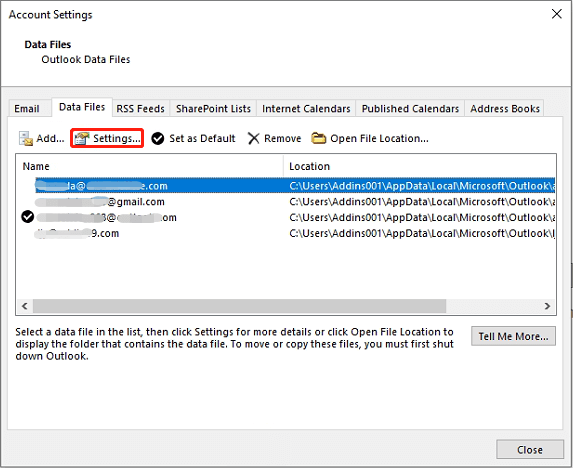 Select «Outlook Data File» and click «Settings.» This will open a new window with the data file settings.