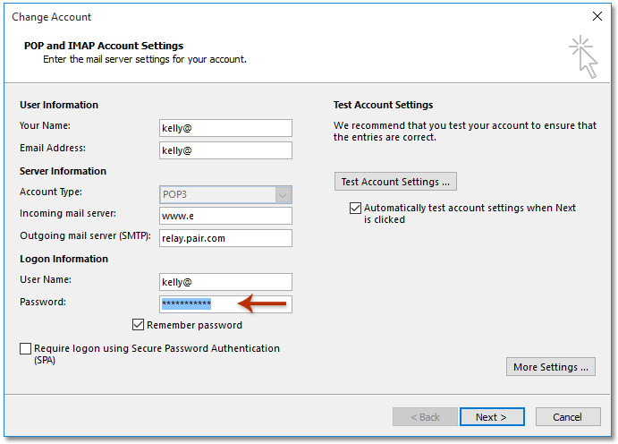 - Remember, this does not change your actual email password. This only changes the password that Outlook tries when it accesses your account.