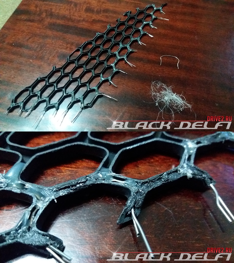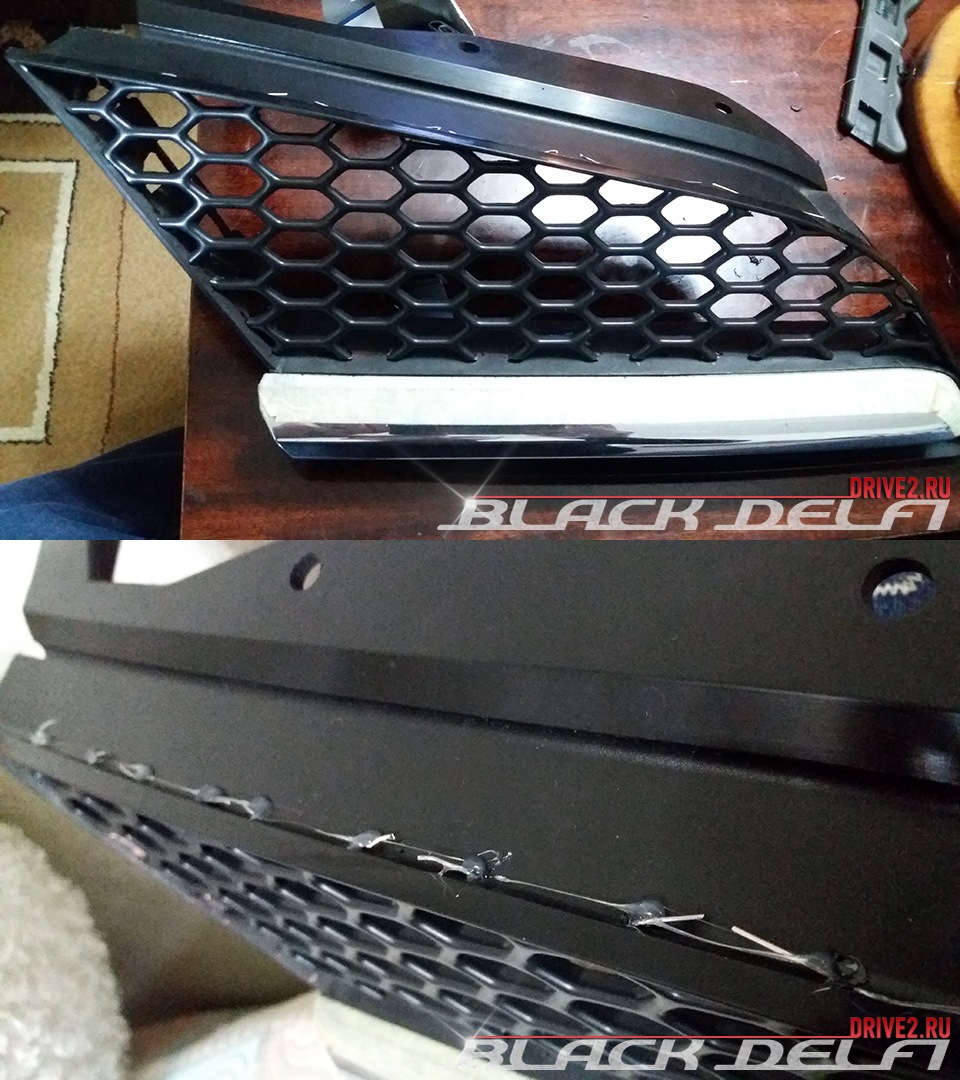 16) Когда решетка вернется от маляра, я еще рекомендую вставить изнутри мелкую сетку. Цель ее – во-первых, скрыть внутрянку авто, так как через крупные соты будет видно радиатор, и все, что вокруг. А колхоз нам ни к чему. Во-вторых, мелкая сетка защитит радиатор от камушков, бджолок и прочего мусора, летящего сквозь крупные соты. Мелкую сетку можно крепить проще – все тем же термоклеем. Если вдруг она отпадет – ее не жалко и можно поставить новую:)