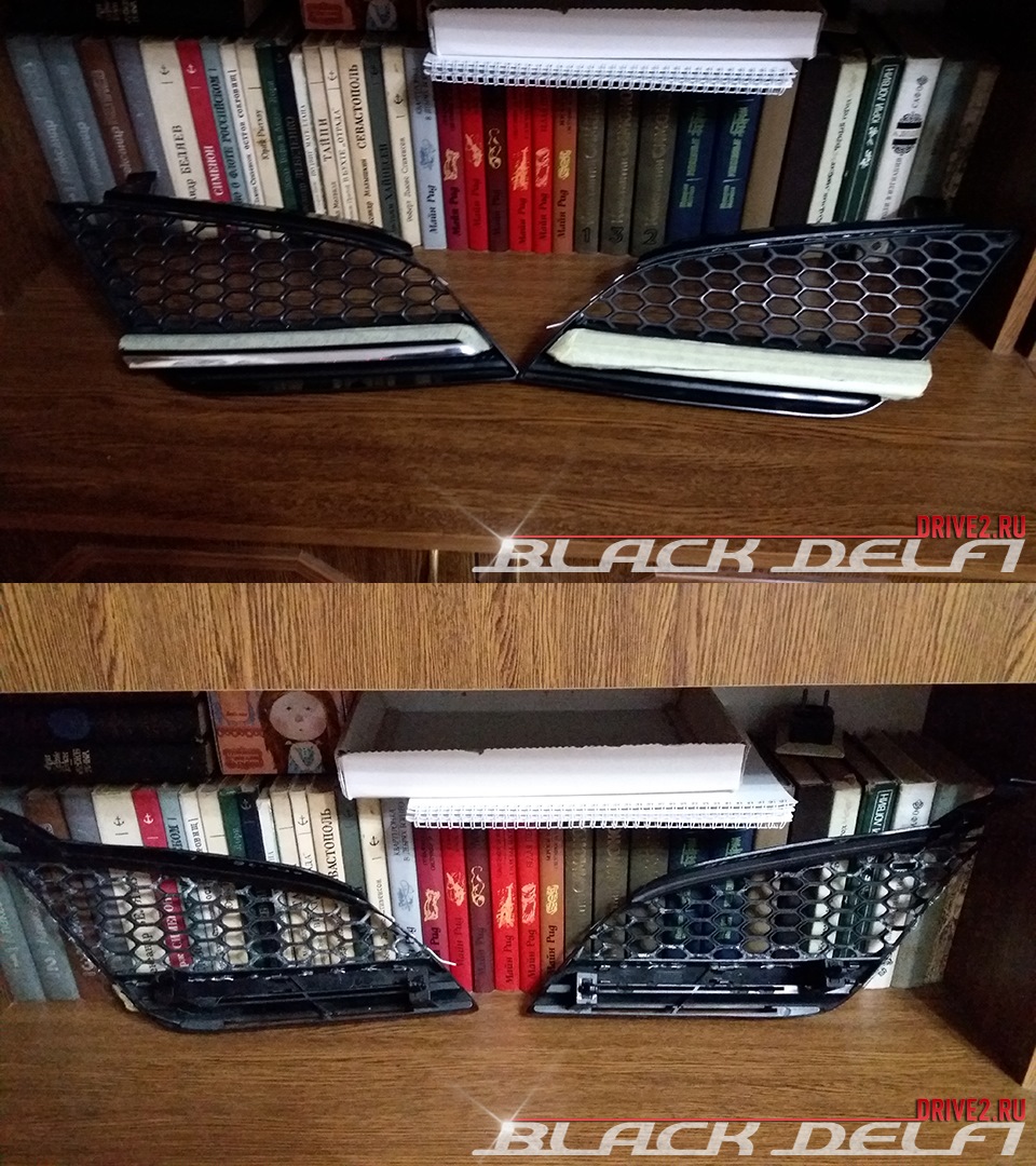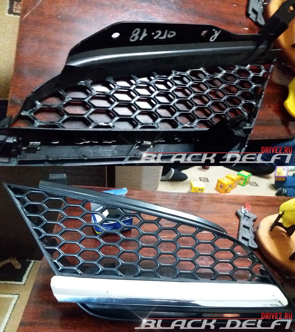 - После снятия старые половинки решётки заменяются новыми, а облицовка фар устанавливается на штатное место.