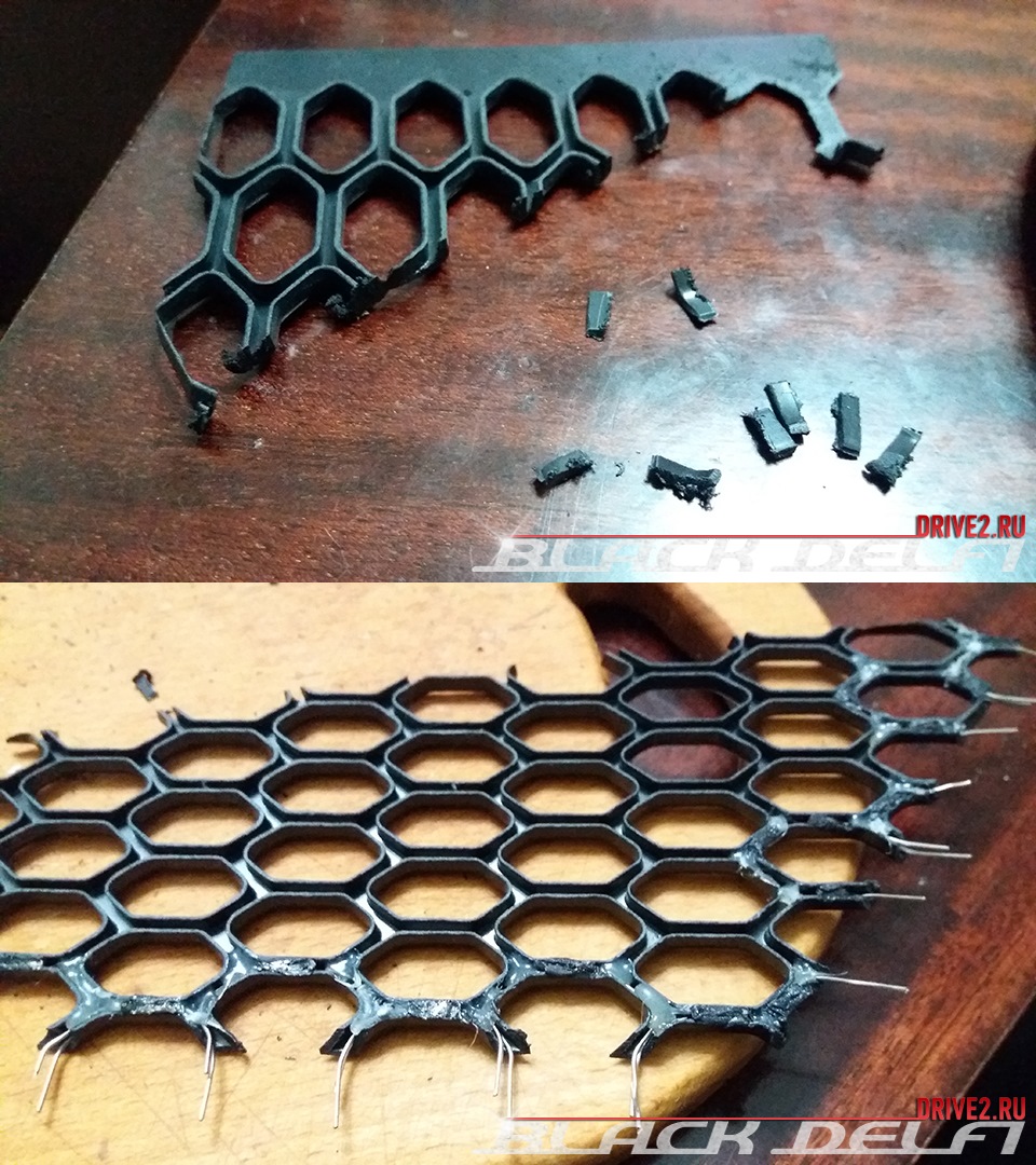14) Итак, надо скрыть все зазоры между сеткой и корпусом. Для этого я вновь обратился к холодной сварке. Сама по себе она меня расстроила, но в паре со скрепками обещает стать отличным креплением. Прикупив в канцелярском магазине набор стеков для пластилина, мелкими кусочками начинаем наносить холодную сварку в места, где надо соединить сетку с корпусом. При этом помним, что сварка должна стать логическим продолжением сетки. Остатки сварки можно зачистить наждачкой, чтобы все было ровненько и красиво. Работа эта очень долгая и напряженная, но спустя еще одни сутки, мы получаем отличный результат в виде цельной, грамотной решетки радиатора с крупными сотами.