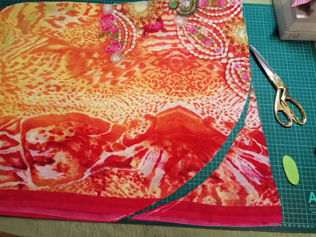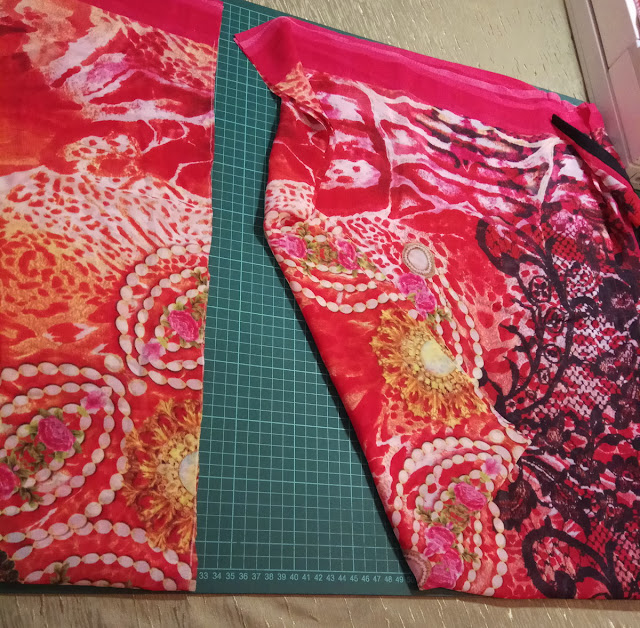 - Пред тем, как наметить линию отреза необходимо отступить еще 1,5 см от намеченной длины для того, чтобы подрубить получившуюся тунику. То есть, отрезают 18,5 см от свободного края изделия.