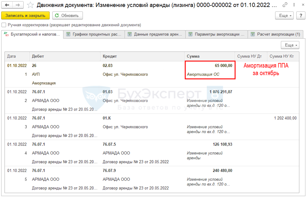 В октябре Амортизация и износ основных средств не сформирует проводок, т.к. амортизация была начислена ранее при изменении условий аренды. Проведите Признание в НУ арендных платежей.