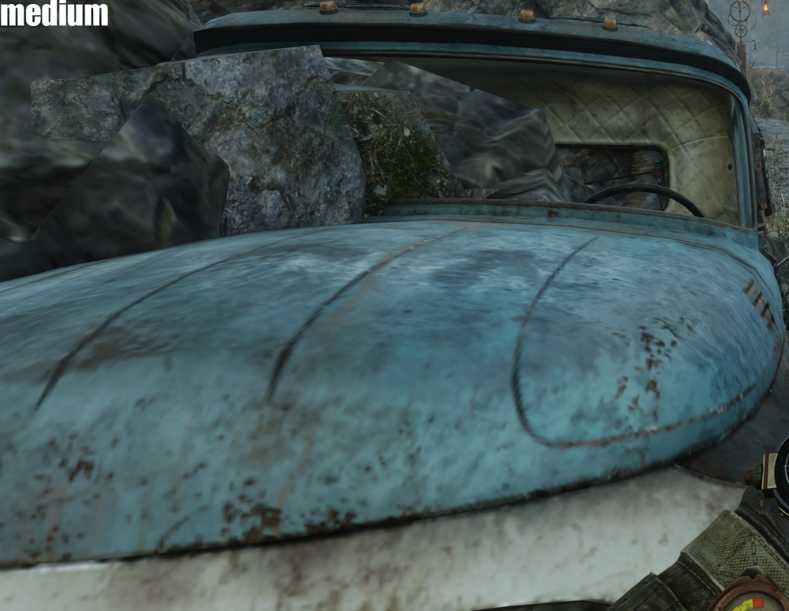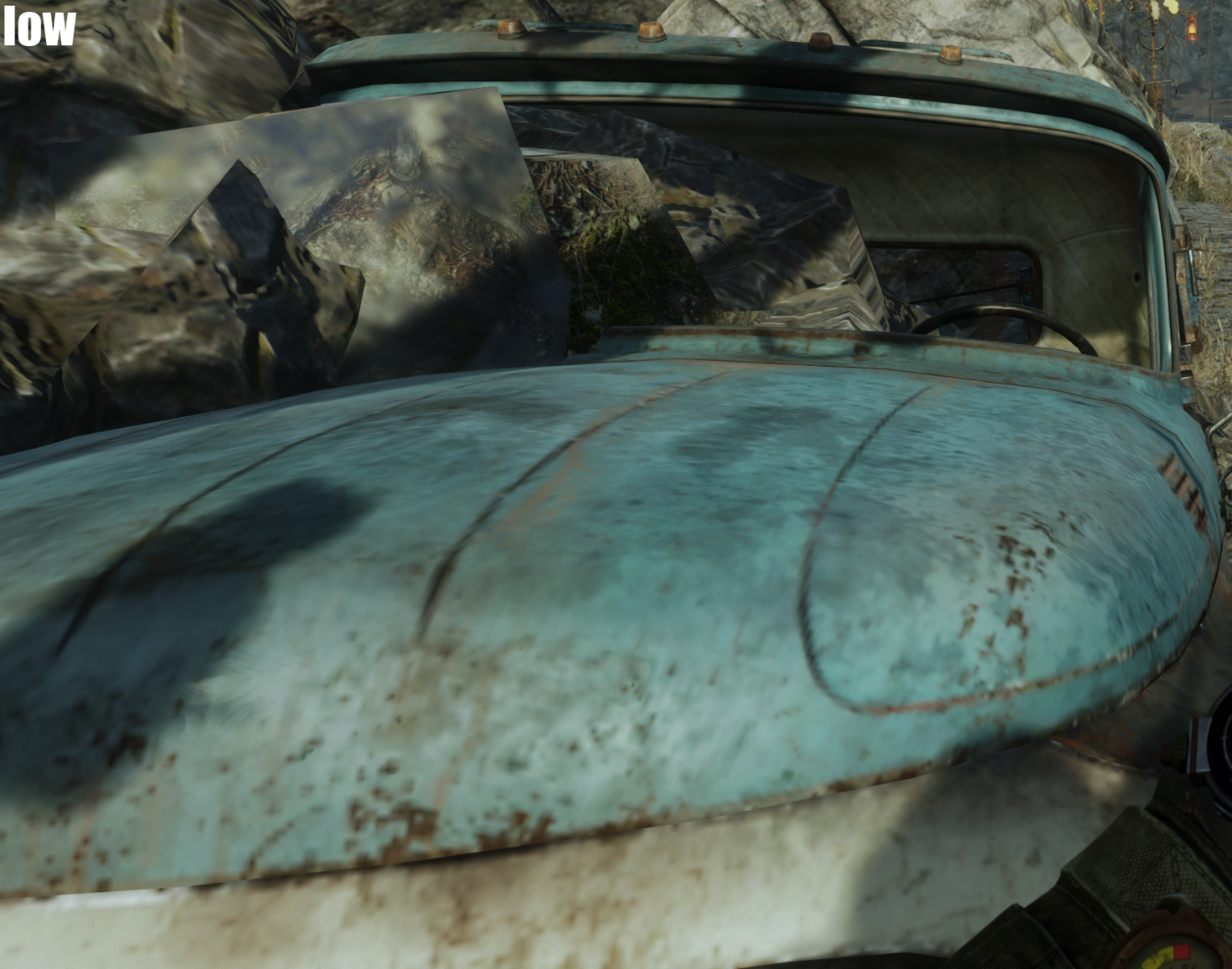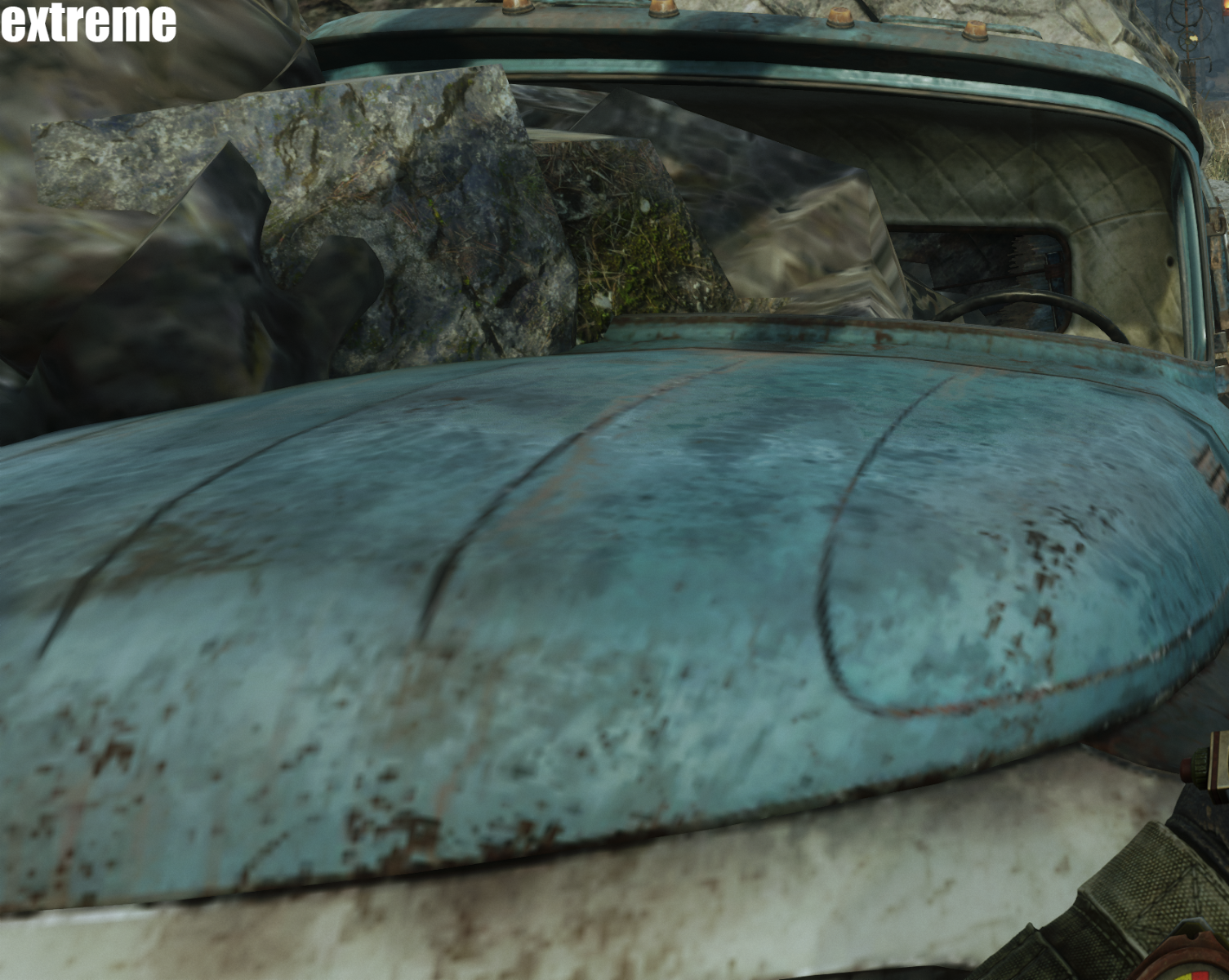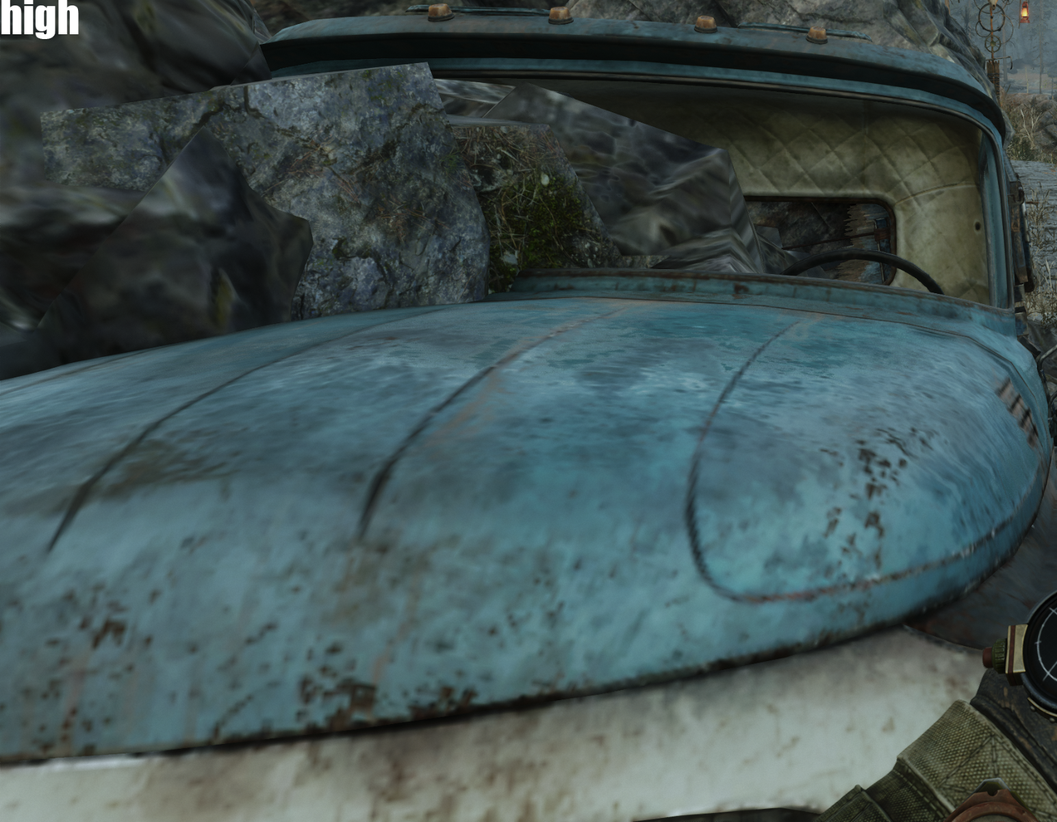 Опять самый большой «графический скачок» происходит при переходе от «низких» настроек графики к «средним». Также стоит отметить, что хоть и самая «мыльная» текстура капота на «низких», но даже «экстремальная» графика не отличилась в этом плане четкостью, как по мне, это позор. даже в Сталкере машины выглядели более четко. Эта же игра своими металлами мне очень напомнила мыльный Fallout 4, где металлические поверхности вроде бы издалека выглядели неплохо, а вблизи все «затекало мылом».
