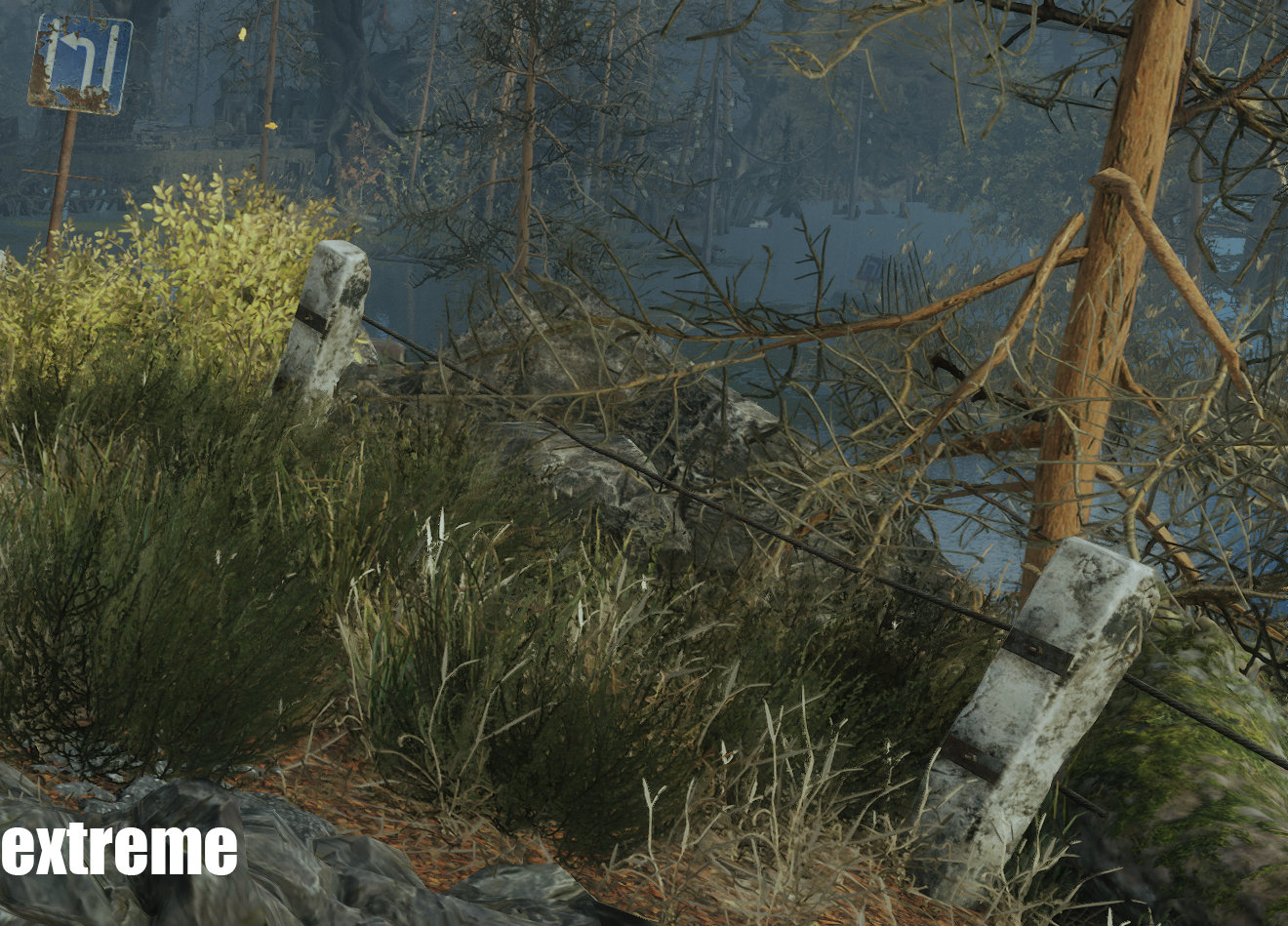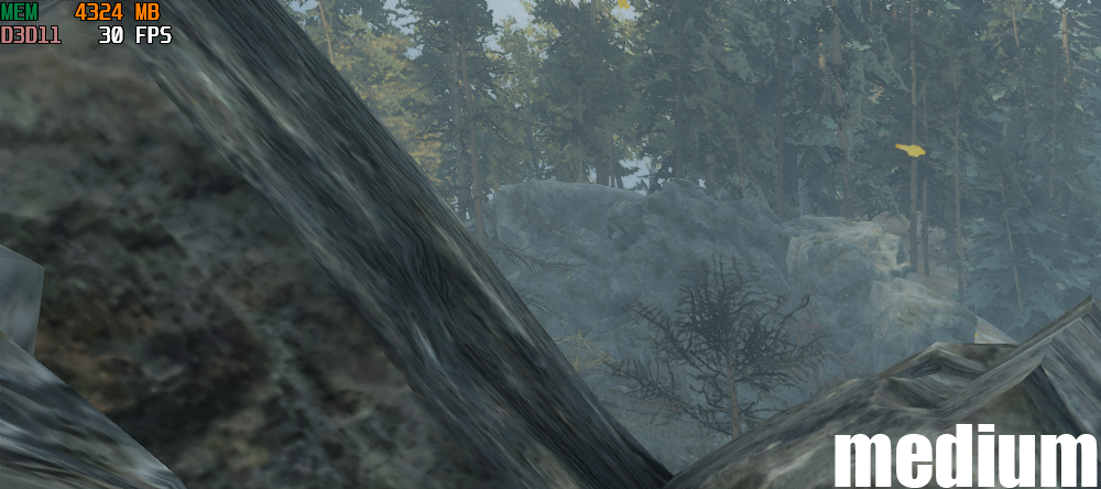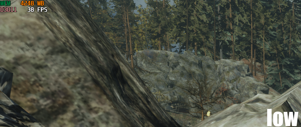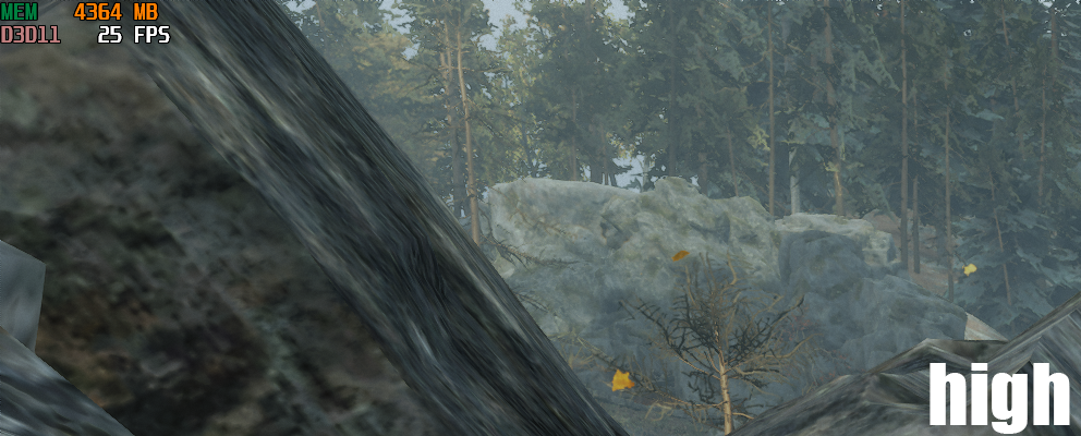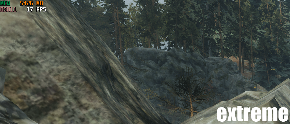 Итак, поздравьте меня! Тут я смог разглядеть, чем «экстрим» отличается от «ультра», присмотритесь к скале на переднем фоне слева. Ее текстурка стала чуть менее мыльная и я бы даже сказал, что прослеживается более четкий параллакс. Также на «экстриме» картинка выглядит более насыщенно, чем на «ультра», которые ничем от «высоких» не отличаются. Хотя, вполне возможно, что тут «виновато» движение солнца, так как погода на локации «Тайга» меняется ежесекундно.