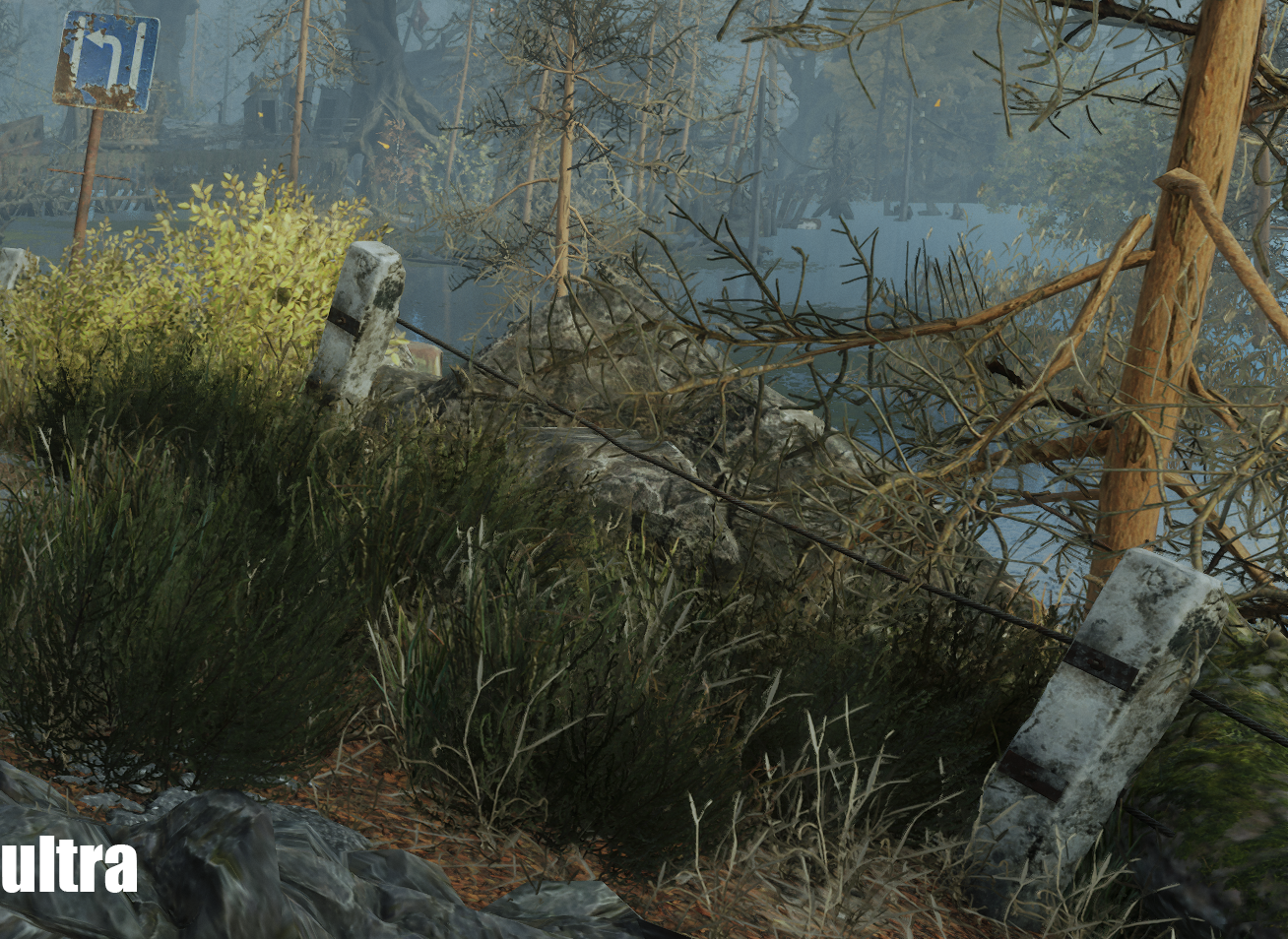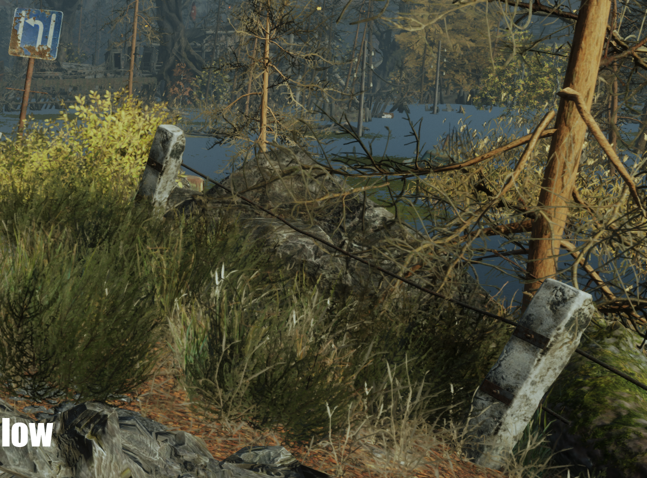 На «низких» настройках графики особо убого выглядит вода. Она не имеет никаких бликов и отражений. Глобальное затемнение отсутствует как таковое, дальних теней нет. Трава аж сливается от того, какая она мыльная. Даже объекты на средней дистанции, такие как дерево с парящими в воздухе ветвями, заметно теряют в мелкой детализации. Конкретно этот фрагмент на низких настройках просто слился «в кашу». Не спасло даже 4К разрешение.