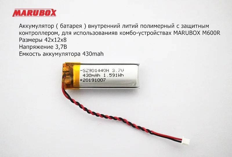 Аккумулятор ( батарея ) внутреннийлитий полимерный с защитным контроллером, емкостью 430 мА-ч для использования в комбо-устройствах MARUBOX M600R. 3 7В. Размеры42x12x8. Эмкостьаккумулятор 430 мАч.