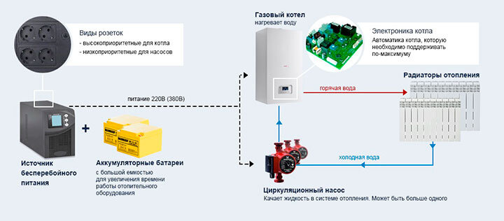 Питание котла Вайлант от ИБП исключает появление символики ложных неисправностей. Блок, в отличие от традиционного стабилизатора, обеспечивает автономное питание отопительного агрегата, и обрывы на ЛЭП, неполадки резервного генератора не вызовут аварийной остановки Vaillant.