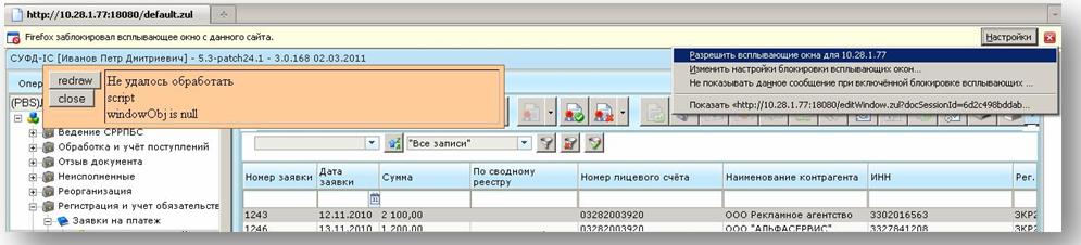 Если у вас Internet Explorer 7,8,9 то нужно добавить в доверенные узлы два узла СУФД: s1500w03.ufk15.roskazna.local, sufd.s1500w03.ufk15.roskazna.local; и сбросить настройки безопасности для этих узлов на низкий(Для этого входите во вкладку «Сервис» -> «Свойства обозревателя» -> вкладка «Безопасность» -> пункт «Надежные узлы» -> кнопка «Узлы», в появившемся окне добавляете два узла: https://s1500w03.ufk15.roskazna.local https://sufd.s1500w03.ufk15.roskazna.local и жмете кнопку «Закрыть». Чтобы сбросить уровень безопасности для надежных узлов на низкий, в пункте «Надежные узлы» жмете на кнопку «Другой»-> в выпадающем списке выбираете «Низкий» ->нажимаете кнопку «Сбросить»-> в окне предупреждения жмете кнопку «Да» и нажимаете «ОК», закрываете «Свойства обозревателя» ). Если у вас Mozilla Firefoх, то во вкладке «Инструменты» -> «Настройки» -> «Содержимое», в пункте «Блокировать всплывающие окна» убираете галочку и жмете кнопку «ОК» |