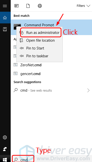 1) На клавиатуре нажмите Ключ с логотипом Windows а также S в то же время. Тип CMD и щелкните правой кнопкой мыши Командная строка и нажмите Запустить от имени администратора.