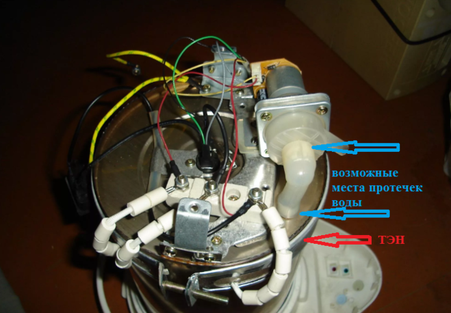 Нужно снять пластиковую крышку закрывающую с низу ТЭН и управляющий элемент. Теперь налейте воды и определите откуда она капает.
