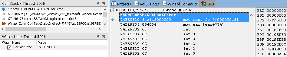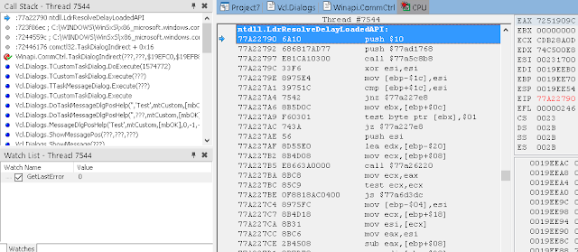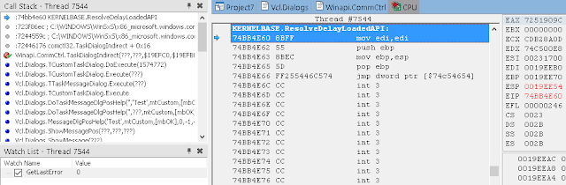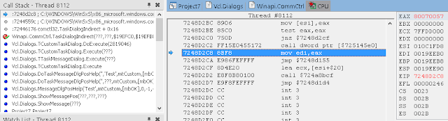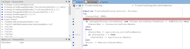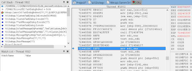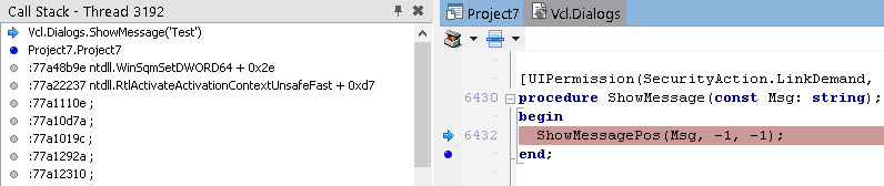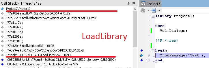 В окне стека вызовов (View / Debug Windows / Call Stack) вы можете видеть, что нас вызвала LoadLibrary, которую, в свою очередь, вызвали мы из Button1Click. К сожалению, отладчик IDE не может полностью реконструировать стек, пропуская некоторые вызовы. Он также не знает где взять отладочную информацию для системных DLL.