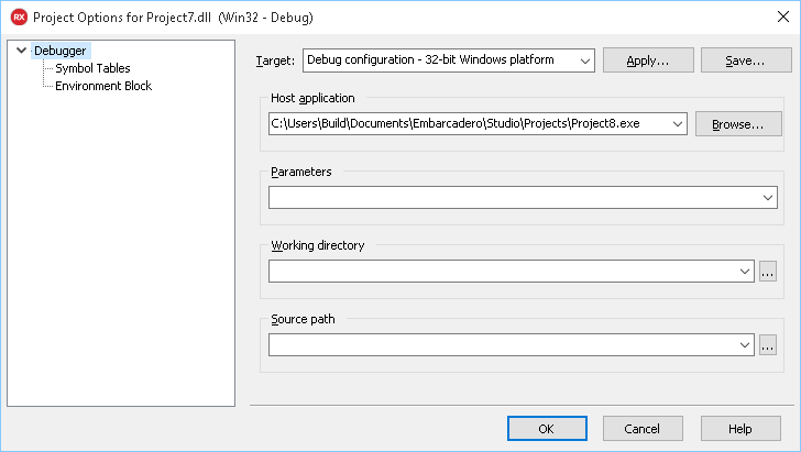 Теперь используем Run / Parameters и укажем для какого исполняемого файла нужно запускать DLL (это делать не нужно, если вместо проекта DLL вы открываете проект EXE):