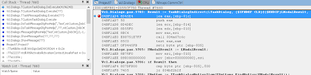Когда вы нажмёте на кнопку в приложении, DLL будет загружена вызовом LoadLibrary, после чего точка останова снова станет действительной. Затем LoadLibrary вызовет DllMain нашей библиотеки с «причиной» = DLL_PROCESS_ATTACH. Для события DLL_PROCESS_ATTACH RTL Delphi автоматически вызывает секции initialization всех модулей из DLL, а также секцию begin/end .dpr файла (и, наоборот, для DLL_PROCESS_DETACH вызываются секции finalization всех модулей). В результате мы встаём на нашей точке останова: