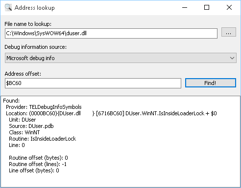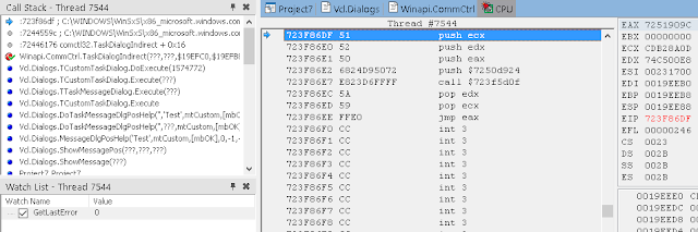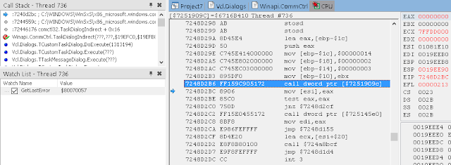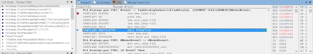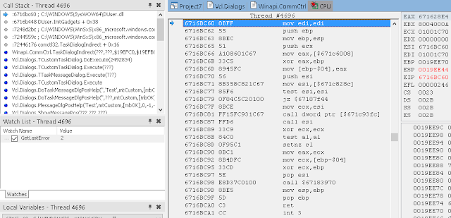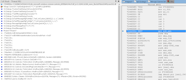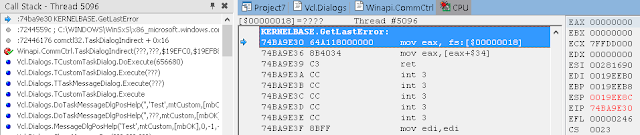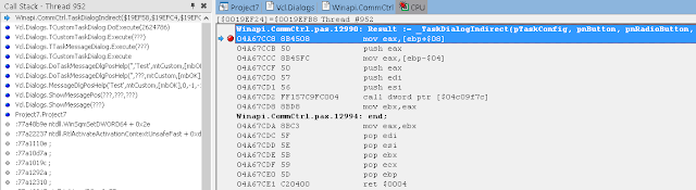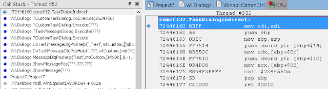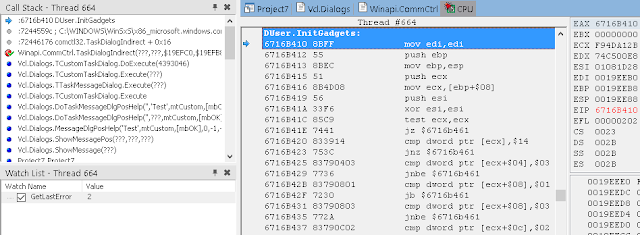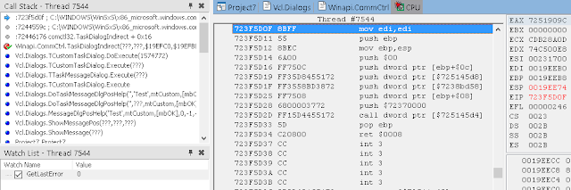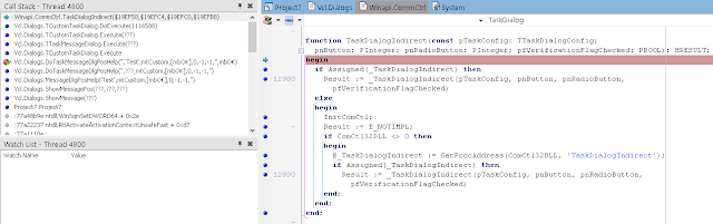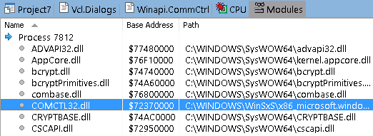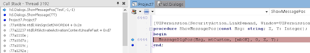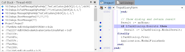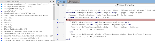 В окне стека вызовов (View / Debug Windows / Call Stack) вы можете видеть, что нас вызвала LoadLibrary, которую, в свою очередь, вызвали мы из Button1Click. К сожалению, отладчик IDE не может полностью реконструировать стек, пропуская некоторые вызовы. Он также не знает где взять отладочную информацию для системных DLL.