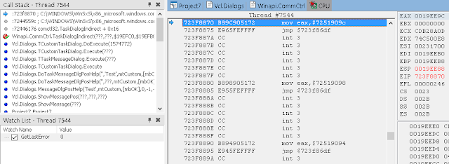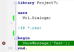 Когда вы нажмёте на кнопку в приложении, DLL будет загружена вызовом LoadLibrary, после чего точка останова снова станет действительной. Затем LoadLibrary вызовет DllMain нашей библиотеки с «причиной» = DLL_PROCESS_ATTACH. Для события DLL_PROCESS_ATTACH RTL Delphi автоматически вызывает секции initialization всех модулей из DLL, а также секцию begin/end .dpr файла (и, наоборот, для DLL_PROCESS_DETACH вызываются секции finalization всех модулей). В результате мы встаём на нашей точке останова: