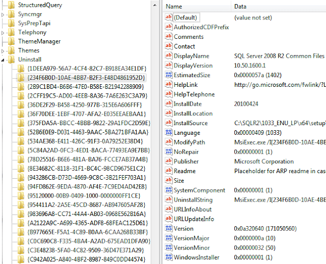В редакторе реестра открываем ключ HKEY_LOCAL_MACHINESOFTWAREMicrosoftWindowsCurrentVersionUninstall,ищем ключи, содержащие параметры с подстрокой «SQL Server»: